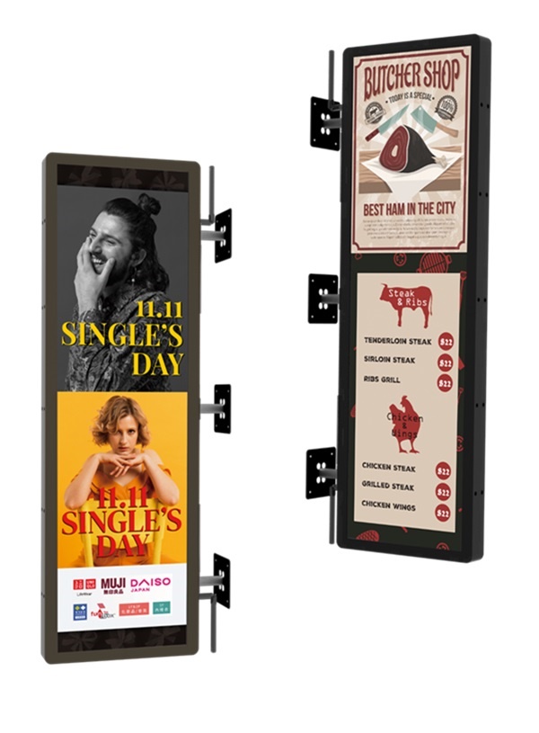 the flag bar signage, with its 4.2-inch modules, comes in both single sided and double-sided version. the single-sided version is ideal for wall-mounted notices, while the double-sided version is perfect for hanging displays. it supports both vertical and horizontal orientations, offering maximum flexibility for diverse visual applications.